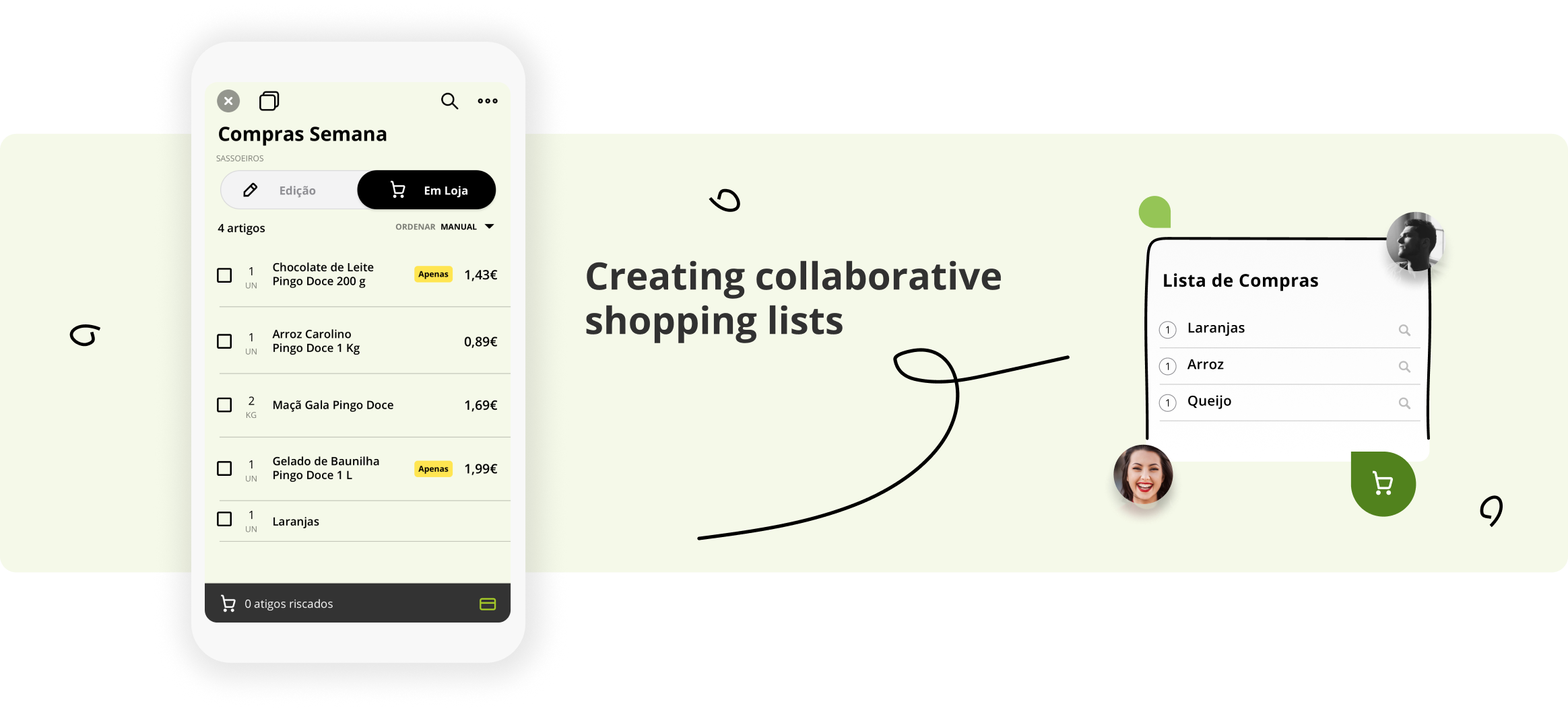 With the app, users can collaboratively create shopping lists (sharing and editing them with others) and order fresh meals from any Pingo Doce store. Items from the list can be associated with actual products to display the final price. Also, customers can cross off items and organize the list by category when visiting the store.